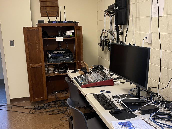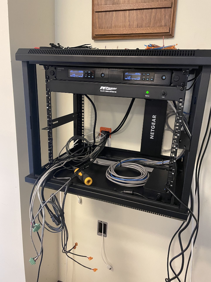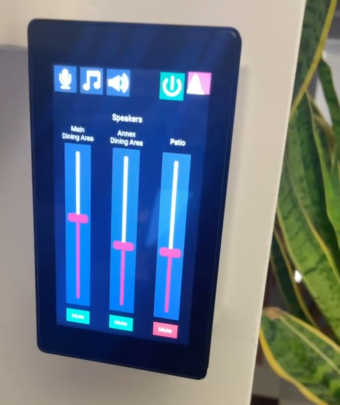 Here we have a sound system for a cafeteria at a school. This system has 3 audio zones, 2 inside and 1 exterior zone. A simple touch screen controls inputs for wireless microphones, and bluetooth audio inputs.